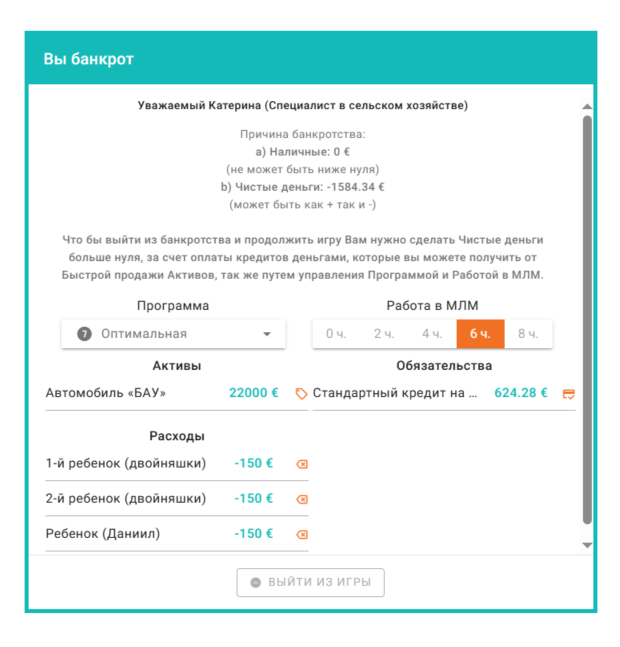 Легко и непринужденно можно «проиграть» и сравнить все возможные виды дохода: работу на кого-то, гос.службу, линейный бизнес, пассивный доход. Попробовать разные профессии. Увидеть какие действия будут более эффективны для увеличения финансов. И это всего за 1,5-2 часа времени получить «консалтинговые услуги». Супер